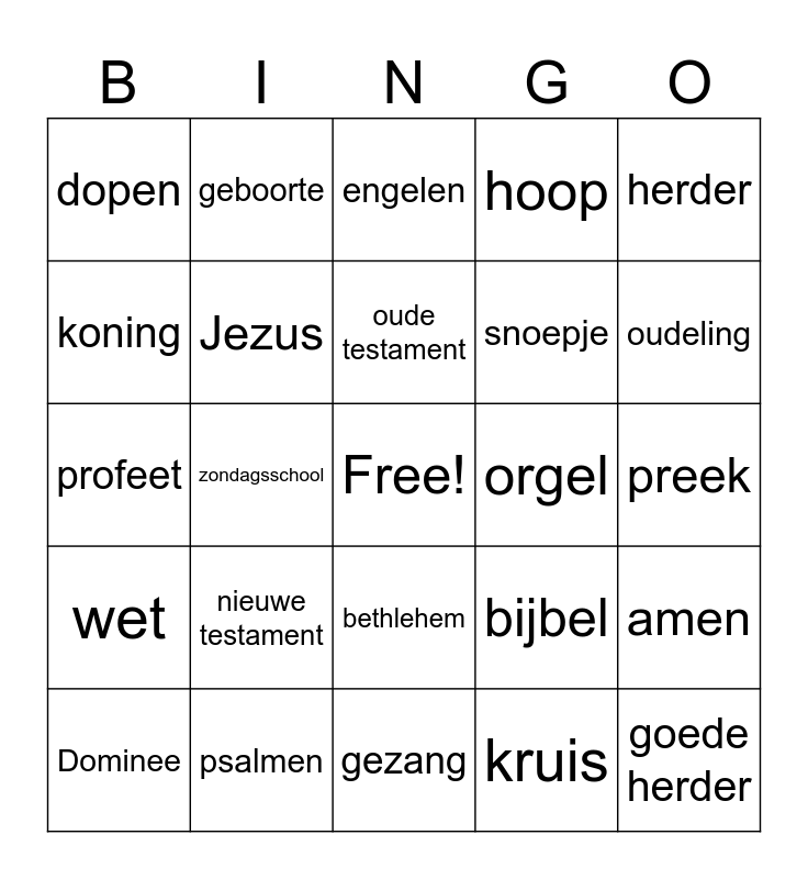 This bingo card has a free space and 29 words: Dominee, opwekking, zondagsschool, psalm, dopen, engelen, Jezus, nieuwe testament, orgel, psalmen, preek, goede herder, gezang, kruis, oudeling, bloemen, bethlehem, wet, herder, profeet, bijbel, hemel, snoepje, koning, hoop, geboorte, amen, oude testament and ezel.