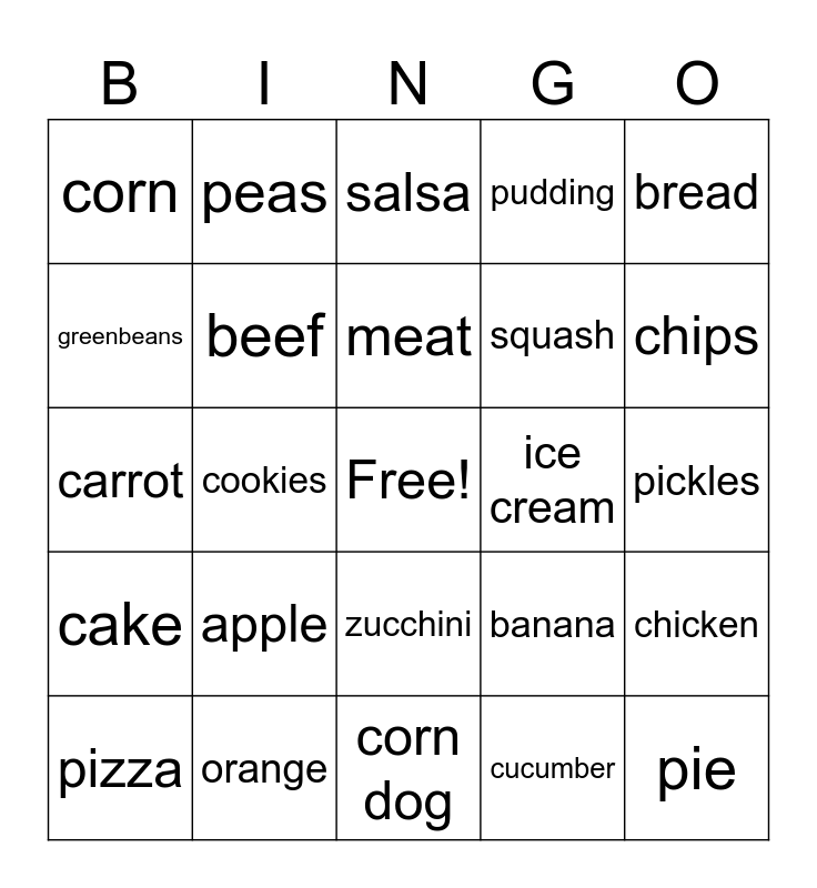 This bingo card has a free space and 24 words: apple, orange, meat, pizza, bread, corn, greenbeans, peas, ice cream, zucchini, squash, carrot, banana, chicken, beef, cucumber, pickles, salsa, chips, cookies, pie, cake, pudding and corn dog.