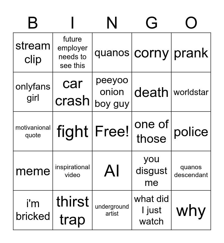 This bingo card has a free space and 24 words: inspirational video, thirst trap, peeyoo onion boy guy, i'm bricked, prank, stream clip, onlyfans girl, future employer needs to see this, one of those, AI, death, motivanional quote, you disgust me, quanos descendant, car crash, what did I just watch, police, quanos, worldstar, fight, why, meme, corny and underground artist.