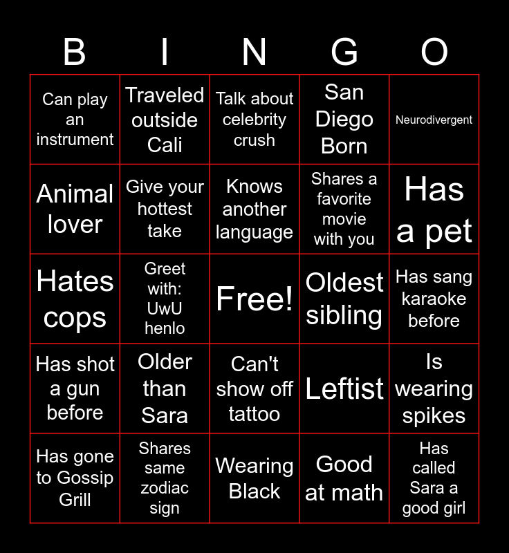 This bingo card has a free space and 24 words: Older than Sara, Shares same zodiac sign, Knows another language, Has gone to Gossip Grill, Neurodivergent, Can play an instrument, Animal lover, Traveled outside Cali, Oldest sibling, Can't show off tattoo, Shares a favorite movie with you, Hates cops, Leftist, Is wearing spikes, Give your hottest take, Good at math, Has sang karaoke before, Talk about celebrity crush, Has a pet, Greet with: UwU henlo, Has called Sara a good girl, Has shot a gun before, San Diego Born and Wearing Black.