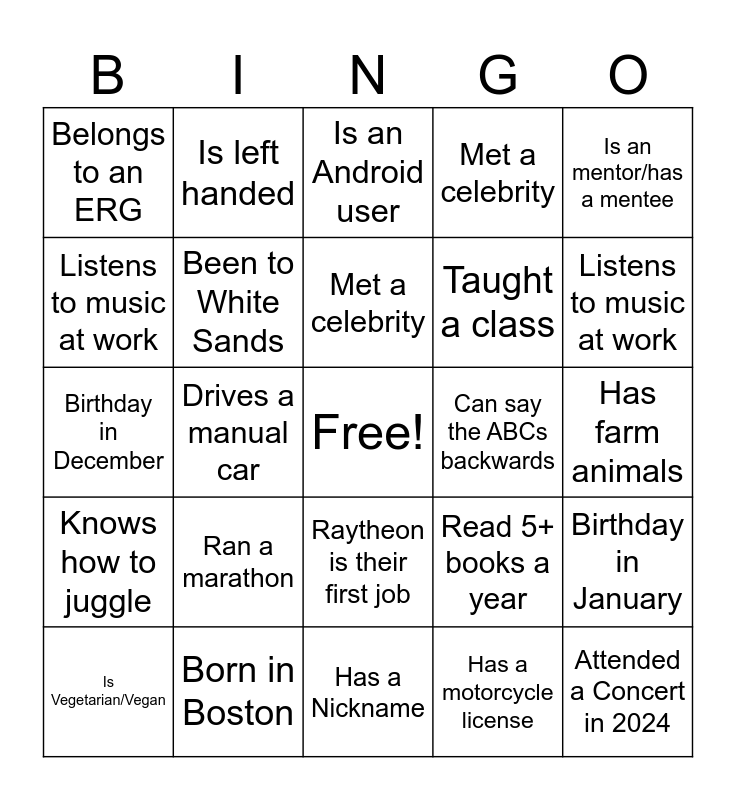 This bingo card has a free space and 54 words: Have 3 or more children, Knows how to juggle, Ran a marathon, Been on TV/Movies, Raytheon is their first job, Been sky-diving, Met a celebrity, Drives a manual car, Listens to music at work, Works out before or after work, Belongs to an ERG, Rode a Hot Air Balloon, Born in Boston, Is Vegetarian/Vegan, Knows how to surf, Has a Nickname, Attended a Concert in 2024, Taught a class, Climbed Mt. Washington, Has farm animals, Read 5+ books a year, Owns a VHS player, Can say the ABCs backwards, Is an mentor/has a mentee, Been at Raytheon for over 20 years, Is left handed, From the west coast, Plays an instrument, Is currently in a sports league, Has a motorcycle license, Has a PHD, Has 3 or more pets, Has completed their Raytheon goals for 2024, Has family that works at Raytheon, Is an Android user, Attend Board Game Night, Birthday in December, Birthday in January, Been to the Badlands, Been to White Sands, Worked on another program besides AN/TPY-2, Broken a bone, Have 3 or more children, Knows how to juggle, Ran a marathon, Been on TV/Movies, Raytheon is their first job, Been sky-diving, Met a celebrity, Drives a manual car, Listens to music at work, Works out before or after work, Belongs to an ERG and Rode a Hot Air Balloon.
