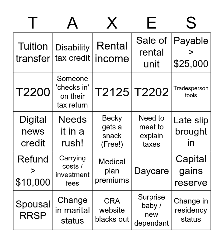 This bingo card has a free space and 32 words: Surprise baby / new dependant, CERB Repayment T4A, Needs it in a rush!, Sale of principle residence, Refund > $10,000, Someone 'checks in' on their tax return, Payable > $25,000, Capital gains reserve, Disability tax credit, Total income > $200,000, T2125, Rental income, T1135, Unusual medical expense, Need to meet to explain taxes, Donations > $1,000, Spousal RRSP, Digital news credit, Medical plan premiums, Carrying costs / investment fees, Daycare, RRSP > $10,000, Late slip brought in, Change in marital status, Change in residency status, Sale of rental unit, T2202, T2200, Tuition transfer, CRA website blacks out, Someone complains about snacks and Tradesperson tools.