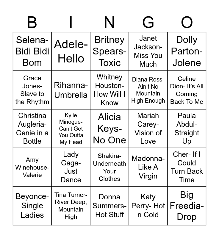 This bingo card has 27 words: Madonna- Like A Virgin, Big Freedia- Drop, Diana Ross- Ain’t No Mountain High Enough, Donna Summers- Hot Stuff, Grace Jones- Slave to the Rhythm, Britney Spears- Toxic, Adele- Hello, Amy Winehouse- Valerie, Mariah Carey- Vision of Love, Cher- If I Could Turn Back Time, Christina Augleria- Genie in a Bottle, Janet Jackson- Miss You Much, Beyonce- Single Ladies, Tina Turner- River Deep, Mountain High, Celine Dion- It’s All Coming Back To Me, P!nk- Get The Party Started, Rihanna- Umbrella, Whitney Houston- How Will I Know, Lady Gaga- Just Dance, Selena- Bidi Bidi Bom, Paula Abdul- Straight Up, Katy Perry- Hot n Cold, Kylie Minogue- Can’t Get You Outta My Head, Alicia Keys- No One, Shakira- Underneath Your Clothes, Dolly Parton- Jolene and Kate Bush- Running Up That Hill.
