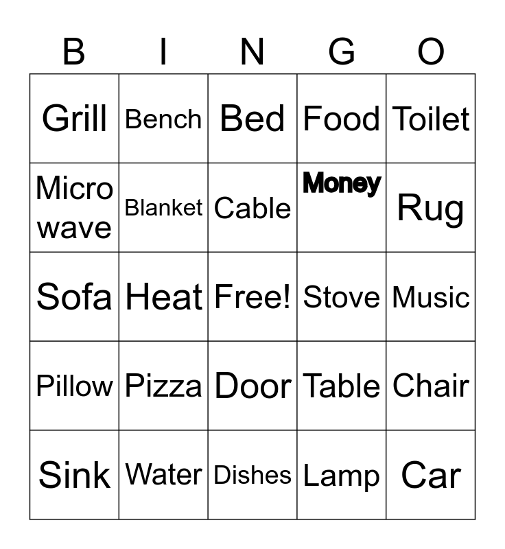 This bingo card has a free space and 24 words: Pizza, Water, Cable, Sink, Toilet, Grill, Micro wave, Bench, Stove, Door, Money, Sofa, Table, Chair, Blanket, Lamp, Music, Bed, Rug, Heat, Car, Pillow, Food and Dishes.