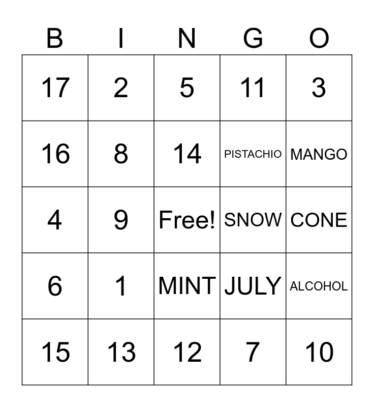 This bingo card has a free space and 24 words: 1, 13, 14, 15, 3, 17, 16, 2, SNOW, MINT, PISTACHIO, 4, JULY, ALCOHOL, 8, 7, CONE, 5, MANGO, 9, 10, 6, 11 and 12.