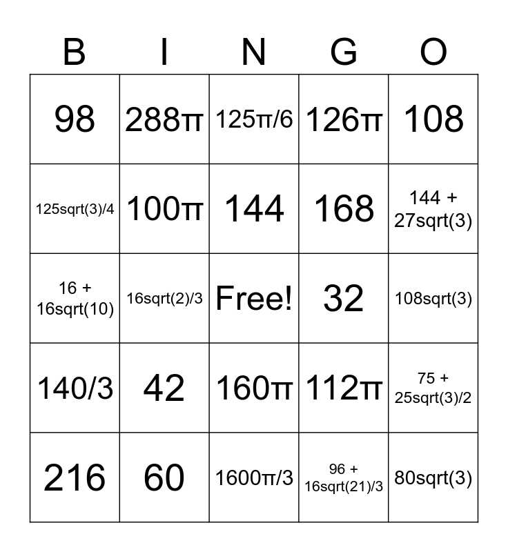 This bingo card has a free space and 24 words: 42, 60, 144, 216, 108, 98, 125sqrt(3)/4, 288π, 32, 160π, 168, 16 + 16sqrt(10), 112π, 75 + 25sqrt(3)/2, 100π, 96 + 16sqrt(21)/3, 108sqrt(3), 125π/6, 144 + 27sqrt(3), 16sqrt(2)/3, 80sqrt(3), 140/3, 126π and 1600π/3.