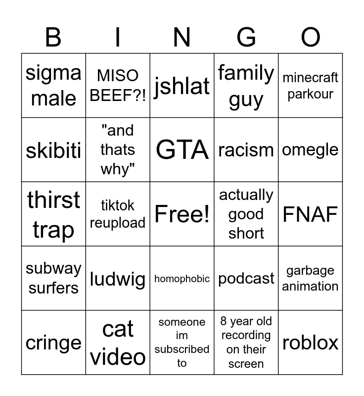 This bingo card has a free space and 24 words: ludwig, cat video, GTA, cringe, minecraft parkour, sigma male, skibiti, MISO BEEF?!, actually good short, homophobic, racism, thirst trap, podcast, garbage animation, "and thats why", 8 year old recording on their screen, FNAF, jshlat, omegle, tiktok reupload, roblox, subway surfers, family guy and someone im subscribed to.