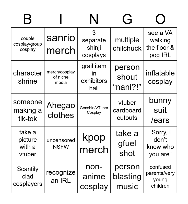 This bingo card has a free space and 29 words: Scantily clad cosplayers, bootleg/stolen/AI art, Ahegao clothes, discounted overwath /nijisanji merch, couple cosplay/group cosplay, 3 separate shinji cosplays, merch/cosplay of niche media, uncensored NSFW, vtuber cardboard cutouts, recognize an IRL, bunny suit /ears, confused parents/very young children, non-anime cosplay, person blasting music, inflatable cosplay, Ita-cars, kpop merch, take a picture with a vtuber, see a VA walking the floor & pog IRL, someone making a tik-tok, take a gfuel shot, attend a panel, person shout “nani?!”, character shrine, multiple chilchuck, sanrio merch, “Sorry, I don’t know who you are”, grail item in exhibitors hall and bass pro shop hat.