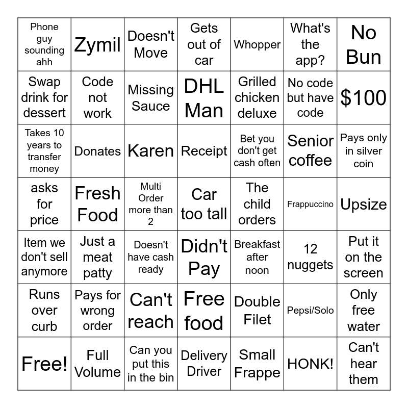 This bingo card has 49 words: Pepsi/Solo, No code but have code, Small Frappe, Fresh Food, Karen, Upsize, Zymil, Can you put this in the bin, What's the app?, Didn't Pay, No Bun, Gets out of car, Senior coffee, Bet you don't get cash often, Pays for wrong order, Frappuccino, Swap drink for dessert, $100, Only free water, Whopper, Grilled chicken deluxe, Multi Order more than 2, Phone guy sounding ahh, Code not work, Free!, Missing Sauce, Pays only in silver coin, Full Volume, Receipt, Donates, Can't hear them, The child orders, Runs over curb, Can't reach, asks for price, Breakfast after noon, 12 nuggets, Put it on the screen, Takes 10 years to transfer money, Doesn't have cash ready, Free food, Item we don't sell anymore, Car too tall, Delivery Driver, DHL Man, Doesn't Move, Double Filet, Just a meat patty and HONK!.