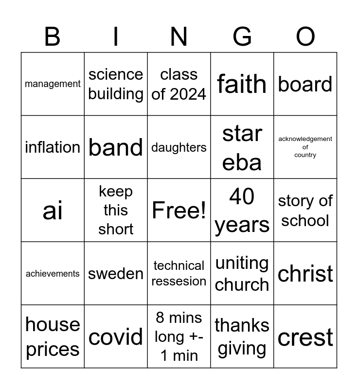This bingo card has a free space and 24 words: sweden, covid, daughters, house prices, board, management, inflation, science building, 40 years, technical ressesion, star eba, ai, uniting church, christ, band, thanks giving, story of school, class of 2024, acknowledgement of country, keep this short, crest, achievements, faith and 8 mins long +- 1 min.
