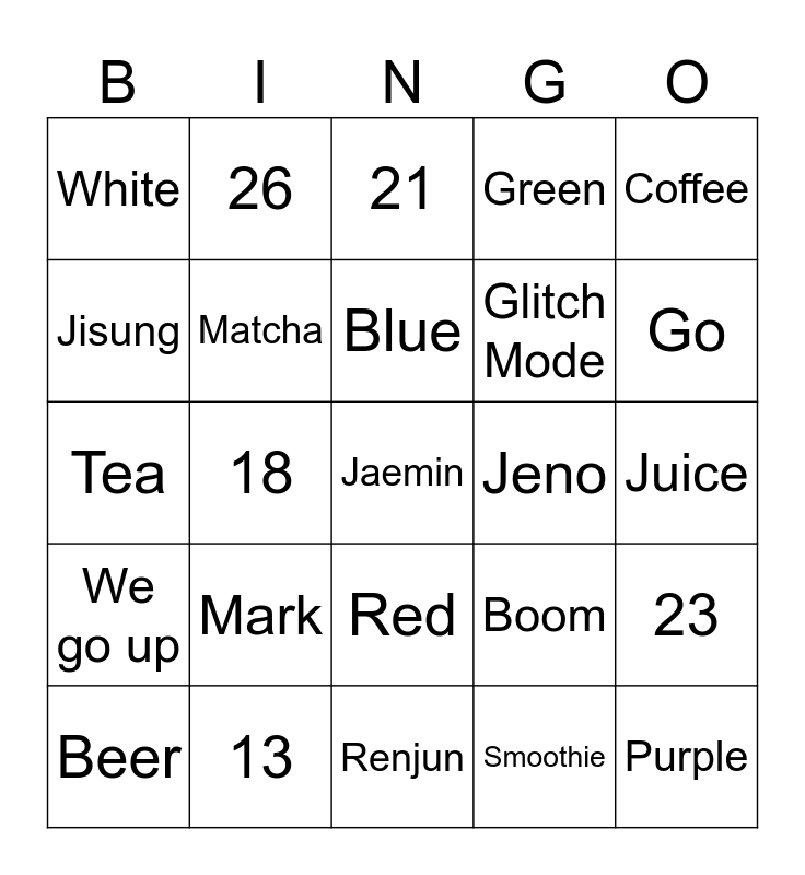This bingo card has a free space and 24 words: Mark, 13, Blue, Beer, Coffee, White, Jisung, 26, Jeno, Red, Glitch Mode, Tea, Boom, 23, Matcha, Smoothie, Juice, 21, Go, 18, Purple, We go up, Green and Renjun.