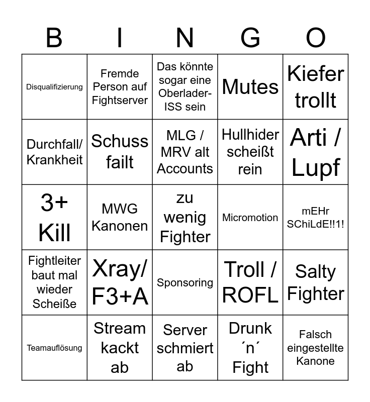 This bingo card has 25 words: Xray/ F3+A, Server schmiert ab, MLG / MRV alt Accounts, Teamauflösung, Kiefer trollt, Disqualifizierung, Durchfall/ Krankheit, Fremde Person auf Fightserver, Micromotion, Sponsoring, Hullhider scheißt rein, 3+ Kill, Troll / ROFL, Salty Fighter, Schuss failt, Falsch eingestellte Kanone, mEHr SChiLdE!!1!, Das könnte sogar eine Oberlader-ISS sein, Arti / Lupf, MWG Kanonen, zu wenig Fighter, Stream kackt ab, Fightleiter baut mal wieder Scheiße, Mutes and Drunk ´n´ Fight.