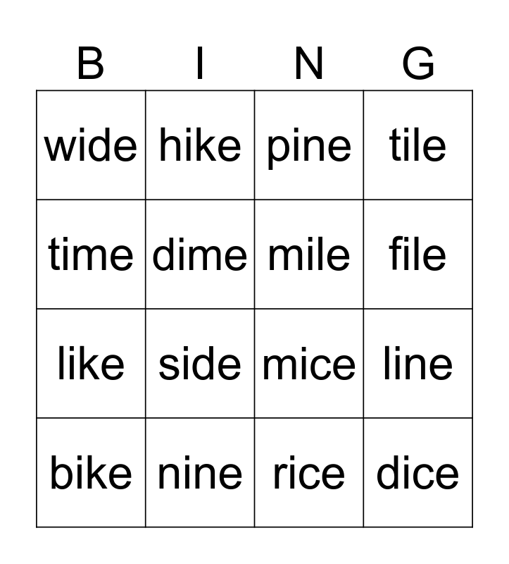 This bingo card has 16 words: nine, line, pine, wide, like, hike, mice, rice, time, dime, bike, tile, side, file, mile and dice.