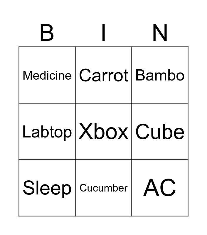 This bingo card has 9 words: Sleep, Bambo, Carrot, Labtop, Medicine, Cube, Xbox, AC and Cucumber.