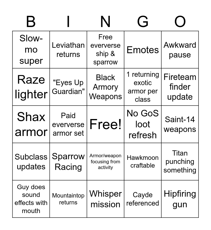 This bingo card has a free space and 24 words: Sparrow Racing, Mountaintop returns, Black Armory Weapons, Guy does sound effects with mouth, Awkward pause, Slow-mo super, Raze lighter, Leviathan returns, No GoS loot refresh, Armor/weapon focusing from activity, 1 returning exotic armor per class, Shax armor, Hawkmoon craftable, Titan punching something, "Eyes Up Guardian", Cayde referenced, Saint-14 weapons, Free eververse ship & sparrow, Fireteam finder update, Paid eververse armor set, Hipfiring gun, Subclass updates, Emotes and Whisper mission.
