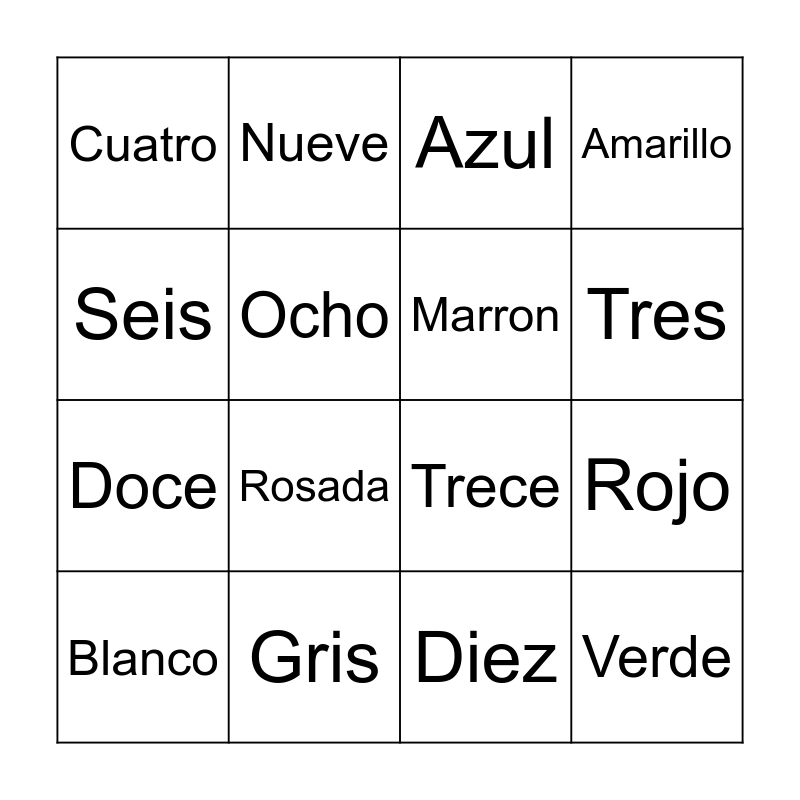 This bingo card has 26 words: Uno, Dos, Tres, Cinco, Seis, Cuatro, Ocho, Nueve, Diez, Once, Doce, Trece, Siete, Quince, Rojo, Anaranjado, Amarillo, Verde, Azul, Blanco, Rosada, Catorce, Gris, Negro, Marron and Morado.