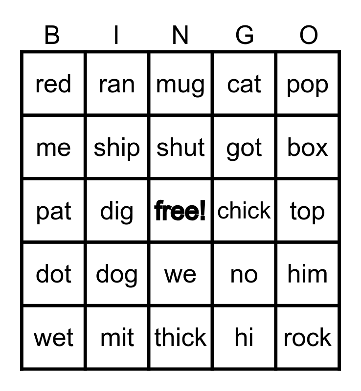 This bingo card has a free space and 24 words: dog, mit, shut, wet, pop, red, me, ran, chick, we, got, pat, no, him, ship, hi, top, mug, box, dig, rock, dot, cat and thick.