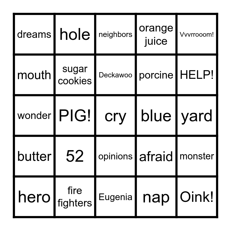 This bingo card has 25 words: 52, Eugenia, Deckawoo, hero, Vvvrrooom!, dreams, mouth, hole, blue, opinions, porcine, wonder, afraid, monster, sugar cookies, Oink!, yard, neighbors, HELP!, PIG!, cry, fire fighters, butter, orange juice and nap.