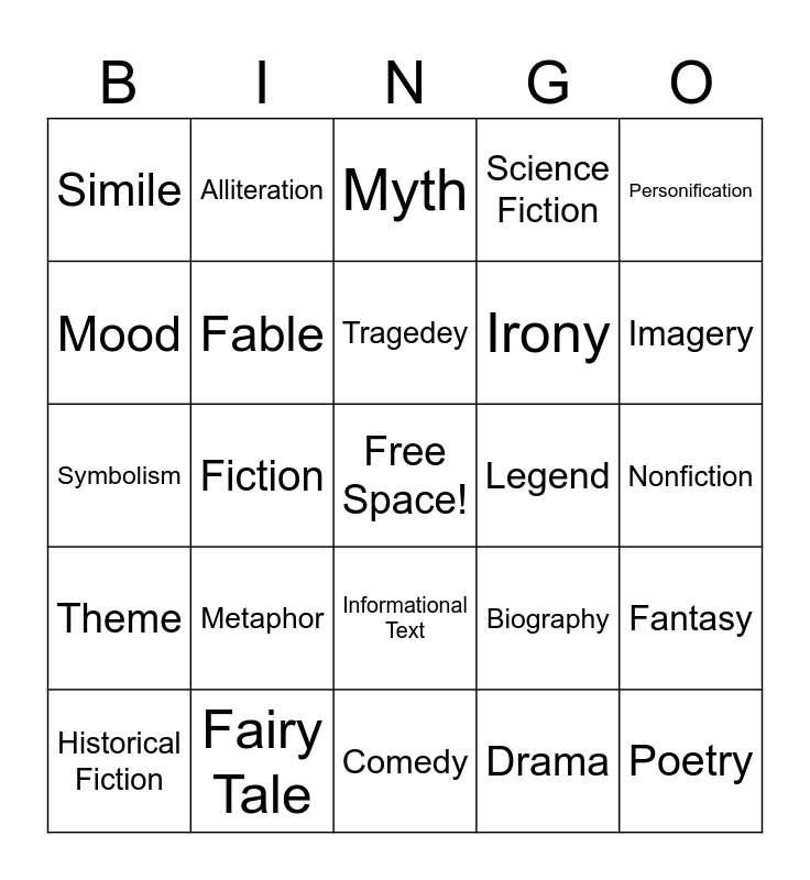 This bingo card has a free space and 29 words: Historical Fiction, Onomatopoeia, Fiction, Hyperbole, Simile, Myth, Fable, Metaphor, Legend, Fairy Tale, Nonfiction, Poetry, Comedy, Drama, Imagery, Autobiography, Informational Text, Theme, Personification, Symbolism, Biography, Short Story, Irony, Mood, Science Fiction, Alliteration, Fantasy, Tragedey and Tone.