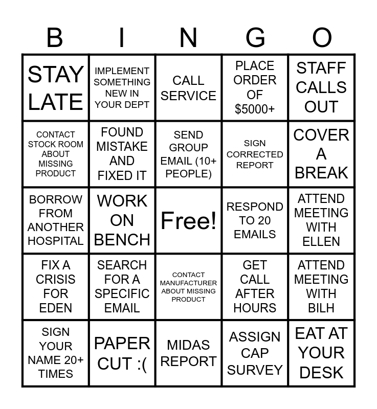 This bingo card has a free space and 24 words: SEARCH FOR A SPECIFIC EMAIL, PAPER CUT :(, SEND GROUP EMAIL (10+ PEOPLE), SIGN YOUR NAME 20+ TIMES, STAFF CALLS OUT, STAY LATE, CONTACT STOCK ROOM ABOUT MISSING PRODUCT, IMPLEMENT SOMETHING NEW IN YOUR DEPT, RESPOND TO 20 EMAILS, CONTACT MANUFACTURER ABOUT MISSING PRODUCT, SIGN CORRECTED REPORT, BORROW FROM ANOTHER HOSPITAL, GET CALL AFTER HOURS, ATTEND MEETING WITH BILH, FOUND MISTAKE AND FIXED IT, ASSIGN CAP SURVEY, ATTEND MEETING WITH ELLEN, CALL SERVICE, COVER A BREAK, WORK ON BENCH, EAT AT YOUR DESK, FIX A CRISIS FOR EDEN, PLACE ORDER OF $5000+ and MIDAS REPORT.