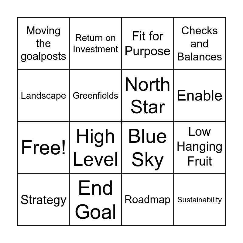 This bingo card has 20 words: Low Hanging Fruit, Journey, Fit for Purpose, Project Management, Strategy, Landscape, End Goal, Moving the goalposts, Free!, Return on Investment, High Level, Blue Sky, Greenfields, Sustainability, North Star, Devil's Advocate, Enable, Checks and Balances, Roadmap and Best Practice.