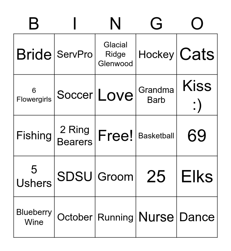 This bingo card has a free space and 44 words: Pauline, SDSU, Osakis, Nurse, Winner, SD, Crooked Willow, Soccer, Football, Hockey, Dance, Bride, October, 25, 69, Bowling, May, Running, Basketball, Travel, Fishing, ServPro, Groom, Dogs, Cats, Friends, Large Family, Love, Remodeled, Elks, Blueberry Wine, Interior, SD, Glacial Ridge Glenwood, 8 Bridesmaids, 9 Groomsmen, 5 Ushers, Cake, Ceremony, Rings, Kiss :), 6 Flowergirls, 2 Ring Bearers, DJ Jennifer, Grandma Barb and Grandma Asta.
