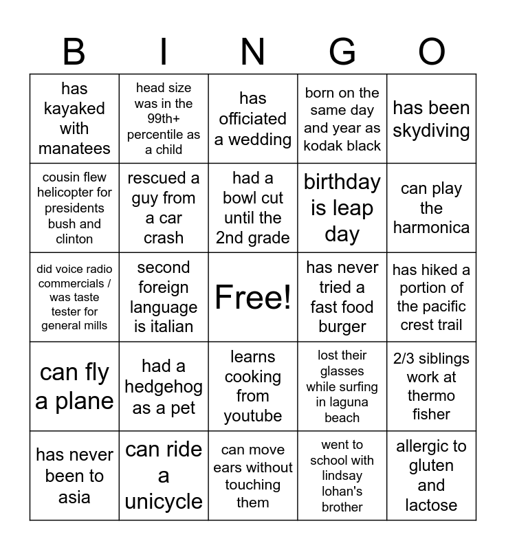 This bingo card has a free space and 33 words: has degree in animal experimentation, traveled 3 weeks on amazon river and slept on hammock in forest, second foreign language is italian, can juggle, can fly a plane, rescued a guy from a car crash, has been skydiving, has never been to asia, head size was in the 99th+ percentile as a child, never broken a bone or been stung by a bee, had a bowl cut until the 2nd grade, has officiated a wedding, attended jimmy buffets last ever concert, was named after ice cream, has never tried a fast food burger, can play the harmonica, can ride a unicycle, did voice radio commercials / was taste tester for general mills, had a hedgehog as a pet, lost their glasses while surfing in laguna beach, learns cooking from youtube, has ridden horses bareback in the ocean, has kayaked with manatees, has hiked a portion of the pacific crest trail, can move ears without touching them, allergic to gluten and lactose, born on the same day and year as kodak black, birthday is leap day, cousin flew helicopter for presidents bush and clinton, 2/3 siblings work at thermo fisher, accused by high school teacher of being in the mob, went to school with lindsay lohan's brother and got a concussion during bubble soccer.