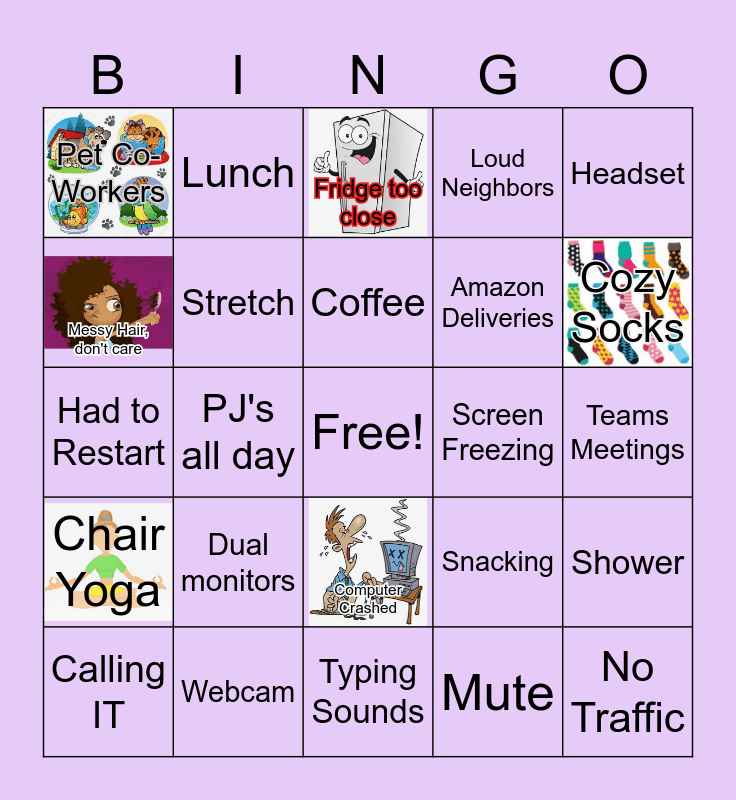 This bingo card has 6 images, a free space and 29 words: Calling IT, Desk, PJ's all day, Wireless Internet, Pet Co-Workers, Fridge too close, Stretch, Dual monitors, Screen Freezing, Webcam, Teams Meetings, No Traffic, Typing Sounds, Mute, Cozy Socks, Awkward Silence, Computer Crashed, Chair Yoga, Headset, Had to Restart, Snacking, Work From Home, Amazon Deliveries, Messy Hair, don't care, Loud Neighbors, Lunch, Shower, Coffee and Water.
