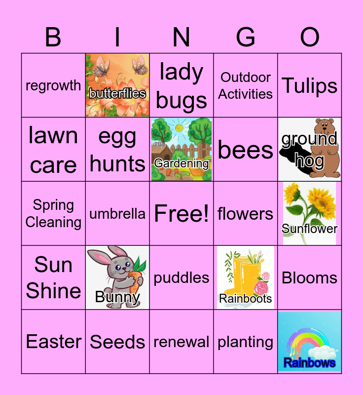 This bingo card has 7 images, a free space and 24 words: Bunny, Seeds, Gardening, Easter, Tulips, regrowth, lawn care, butterflies, flowers, puddles, bees, Spring Cleaning, Rainboots, Blooms, egg hunts, planting, Sunflower, lady bugs, ground hog, umbrella, Rainbows, Sun Shine, Outdoor Activities and renewal.