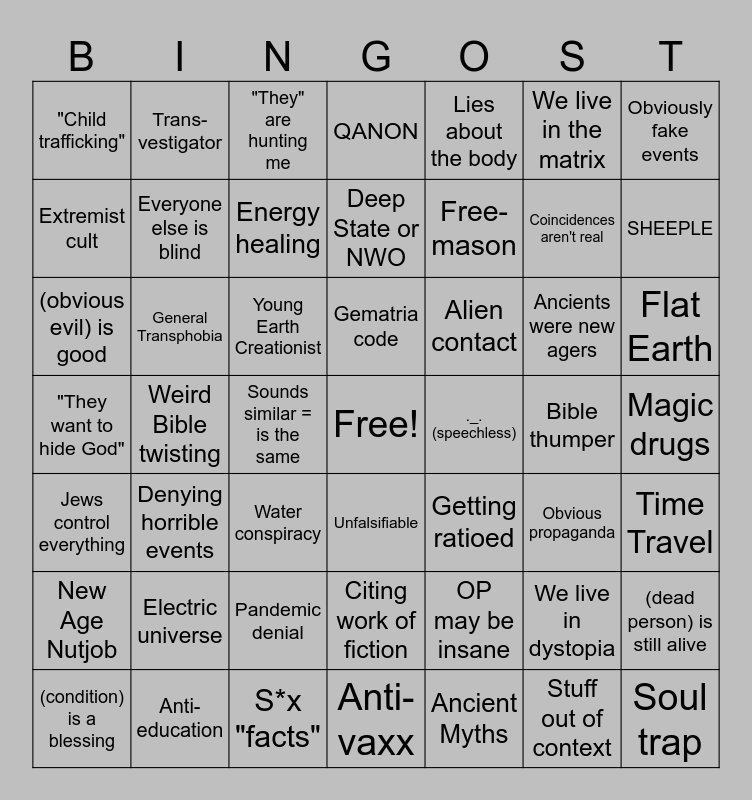 This bingo card has a free space and 72 words: (politician) is evil, Trans-vestigator, Energy healing, Anti-vaxx, Demons invading us, Hollow Earth, SHEEPLE, New Age Nutjob, General Transphobia, Soul stealing, Deep State or NWO, Supposedly predicted events, We live in the matrix, Obviously fake events, (unsafe thing) is good for you, Weird Bible twisting, Young Earth Creationist, QANON, OP may be insane, Ancients were new agers, Flat Earth, "Child trafficking", Denying horrible events, Sounds similar = is the same, ._. (speechless), We live in dystopia, (dead person) is still alive, Jews control everything, Anti-education, Pandemic denial, Gematria code, Ancient Myths, Gay Agenda, Multi-paragraph meltdown, Extremist cult, I saw it myself, S*x "facts", "Ex-cabal", Lies about the body, Obvious propaganda, Magic drugs, (obvious evil) is good, PAGANS, Supposed channeler, Citing work of fiction, Alien contact, Bible thumper, Soul trap, Chaining things together, Demonic possession, Water conspiracy, "I'm a psychic", Getting ratioed, Coincidences aren't real, Time Travel, Secret space programs, Everyone else is blind, "They" are hunting me, Sovereign Citizen stuff, Angelic possession / channeling, "Truth Seeker", Actually Wholesome, "They want to hide God", Electric universe, "We all have these powers", Unfalsifiable, Free-mason, Stuff out of context, Bad experiment, (condition) is a blessing, Double down over and over and "This is being censored".