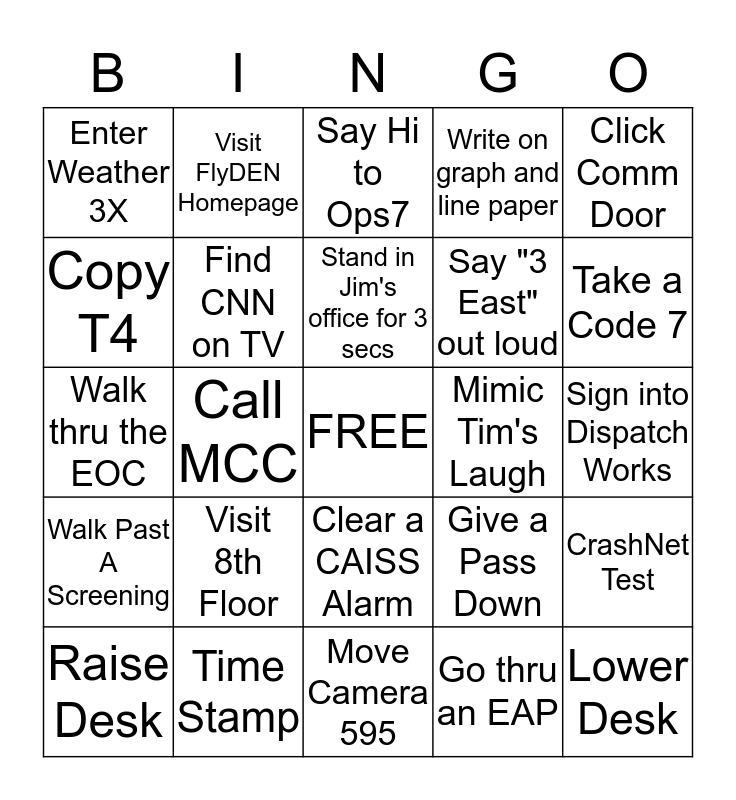 This bingo card has a free space and 24 words: Visit 8th Floor, Time Stamp, Stand in Jim's office for 3 secs, Raise Desk, Click Comm Door, Enter Weather 3X, Copy T4, Visit FlyDEN Homepage, Mimic Tim's Laugh, Clear a CAISS Alarm, Say "3 East" out loud, Walk thru the EOC, Give a Pass Down, CrashNet Test, Find CNN on TV, Go thru an EAP, Sign into Dispatch Works, Say Hi to Ops7, Take a Code 7, Call MCC, Lower Desk, Walk Past A Screening, Write on graph and line paper and Move Camera 595.