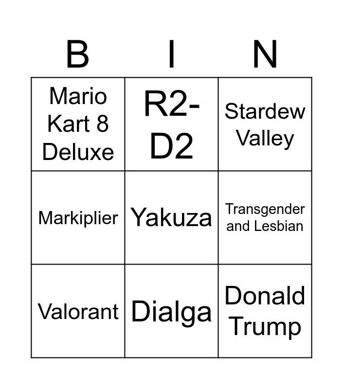 This bingo card has 9 words: Valorant, Stardew Valley, R2-D2, Markiplier, Mario Kart 8 Deluxe, Transgender and Lesbian, Yakuza, Donald Trump and Dialga.
