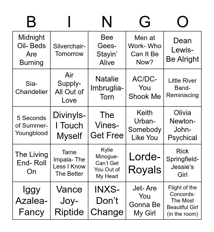 This bingo card has 27 words: Lorde- Royals, Flight of the Concords- The Most Beautiful Girl (in the room), AC/DC- You Shook Me, INXS- Don’t Change, Sia-Chandelier, Bee Gees- Stayin’ Alive, Silverchair- Tomorrow, The Living End- Roll On, Keith Urban- Somebody Like You, Rick Springfield- Jessie’s Girl, 5 Seconds of Summer- Youngblood, Men at Work- Who Can It Be Now?, Iggy Azalea- Fancy, Vance Joy- Riptide, Little River Band-Reminiscing, Gotye- Somebody That I Used To Know, Air Supply- All Out of Love, Natalie Imbruglia- Torn, Tame Impala- The Less I Know The Better, Midnight Oil- Beds Are Burning, Olivia Newton- John- Psychical, Jet- Are You Gonna Be My Girl, Divinyls- I Touch Myself, The Vines- Get Free, Kylie Minogue- Can’t Get You Out of My Head, Dean Lewis- Be Alright and The Beths- Future Me Hates Me.