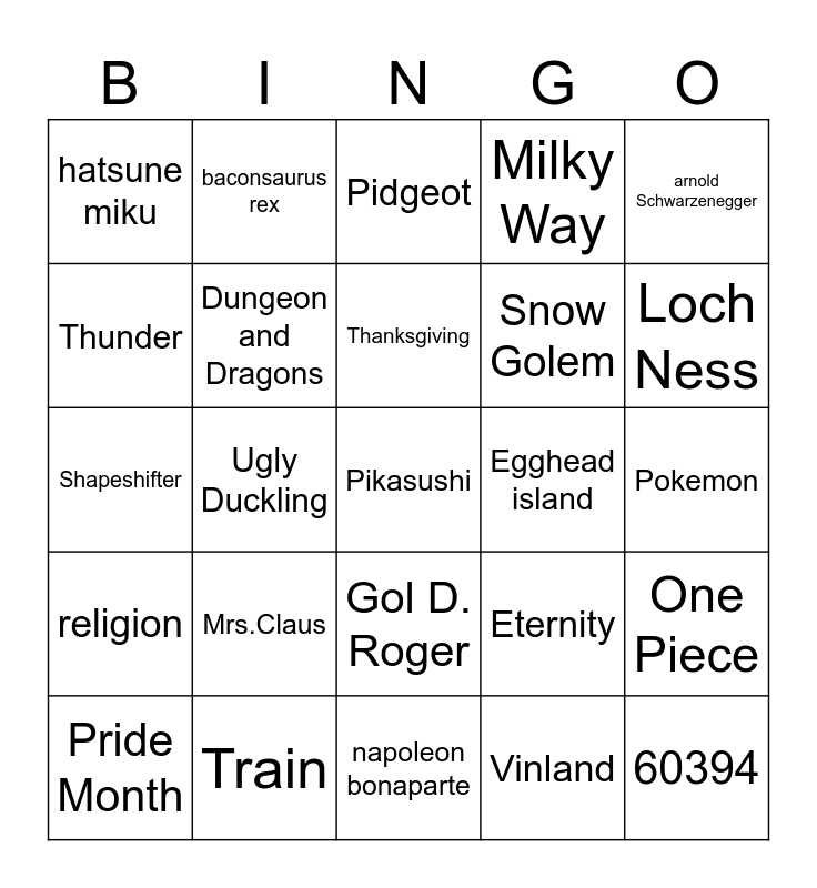 This bingo card has a free space and 24 words: Mrs.Claus, Train, Thanksgiving, Pride Month, arnold Schwarzenegger, hatsune miku, Thunder, baconsaurus rex, Egghead island, Gol D. Roger, Snow Golem, Shapeshifter, Eternity, One Piece, Dungeon and Dragons, Vinland, Pokemon, Pidgeot, Loch Ness, Ugly Duckling, 60394, religion, Milky Way and napoleon bonaparte.