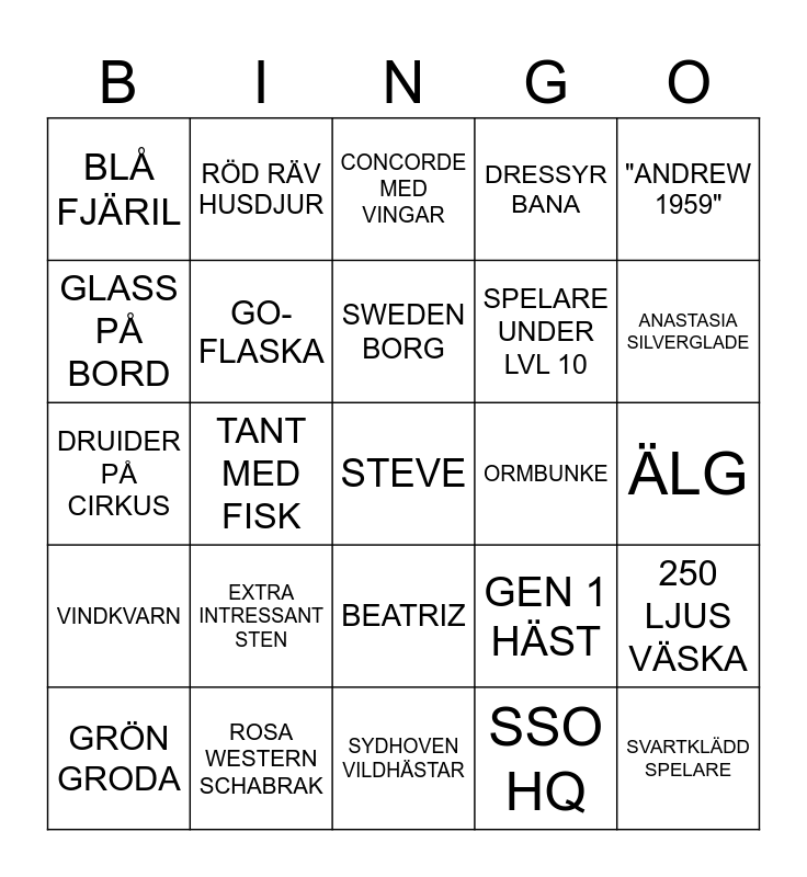 This bingo card has a free space and 24 words: EXTRA INTRESSANT STEN, ROSA WESTERN SCHABRAK, SWEDEN BORG, GRÖN GRODA, "ANDREW 1959", BLÅ FJÄRIL, GLASS PÅ BORD, RÖD RÄV HUSDJUR, ORMBUNKE, BEATRIZ, SPELARE UNDER LVL 10, DRUIDER PÅ CIRKUS, GEN 1 HÄST, 250 LJUS VÄSKA, GO-FLASKA, SSO HQ, ÄLG, CONCORDE MED VINGAR, ANASTASIA SILVERGLADE, TANT MED FISK, SVARTKLÄDD SPELARE, VINDKVARN, DRESSYR BANA and SYDHOVEN VILDHÄSTAR.