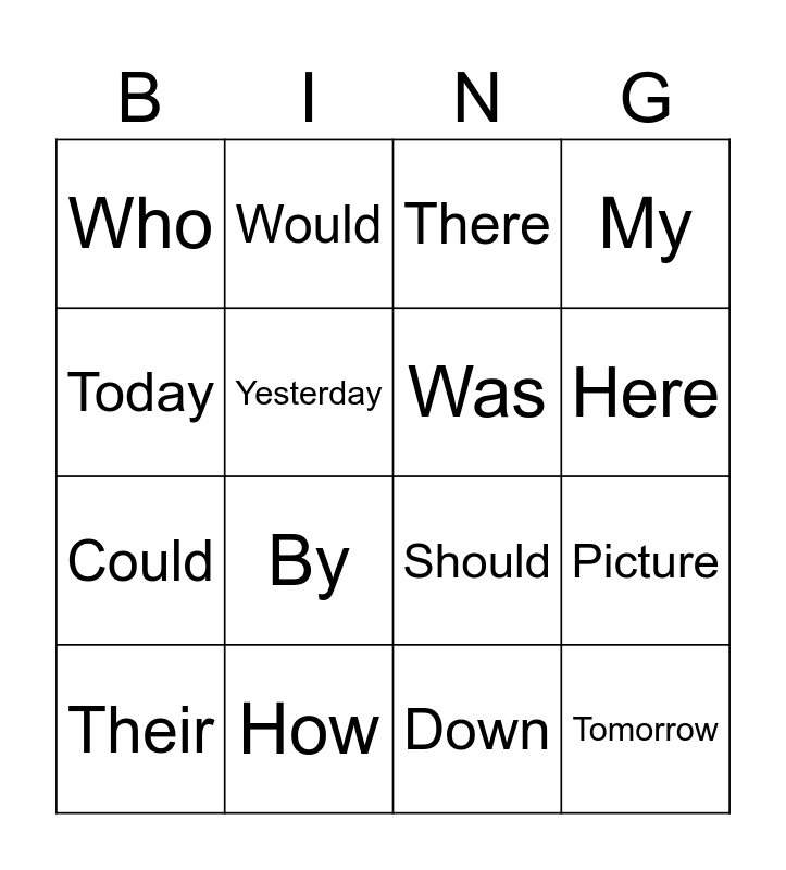 This bingo card has 16 words: How, Picture, There, Who, Could, Would, Should, Down, Today, Yesterday, Their, My, By, Here, Was and Tomorrow.