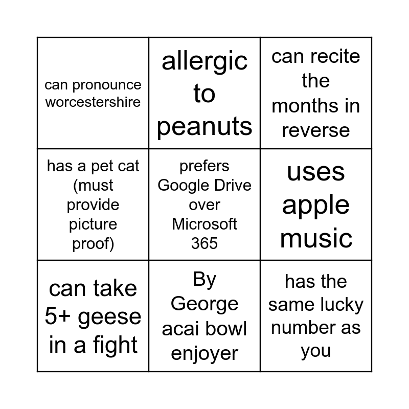 This bingo card has 9 words: can take 5+ geese in a fight, can recite the months in reverse, allergic to peanuts, has a pet cat (must provide picture proof), can pronounce worcestershire, uses apple music, prefers Google Drive over Microsoft 365, has the same lucky number as you and By George acai bowl enjoyer.
