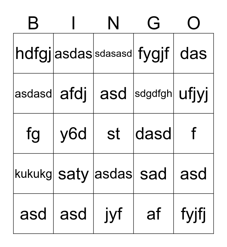 This bingo card has a free space and 24 words: saty, asd, asd, asd, das, hdfgj, asdasd, asdas, dasd, asdas, sdgdfgh, fg, sad, asd, afdj, af, f, sdasasd, ufjyj, y6d, fyjfj, kukukg, fygjf and jyf.