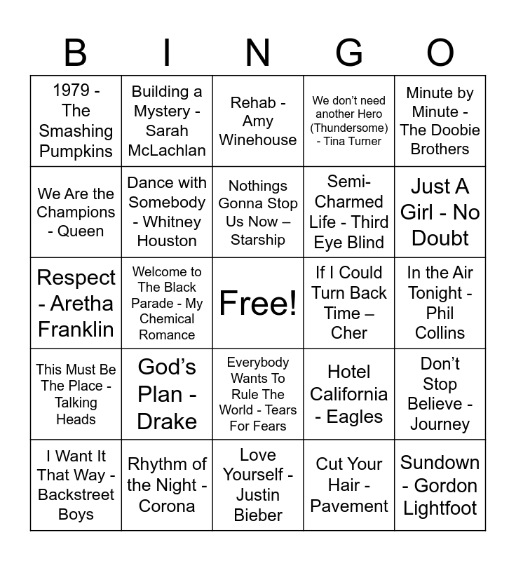 This bingo card has a free space and 49 words: The Lovecats - The Cure, Sundown - Gordon Lightfoot, How You Remind Me - Nickelback, Love Yourself - Justin Bieber, God’s Plan - Drake, I’m Like a Bird - Nelly Furtado, Building a Mystery - Sarah McLachlan, I Feel It All - Feist, We Are the Champions - Queen, Always Look at the Bright Side of Life - Eric Idle, Dance with Somebody - Whitney Houston, We don’t need another Hero (Thundersome) - Tina Turner, Don’t Stop Believe - Journey, Hotel California - Eagles, Black Velvet - Alannah Myles, Hold On - Wilson Philips, Nothings Gonna Stop Us Now – Starship, If I Could Turn Back Time – Cher, Time in a Bottle - Jim Croce, Minute by Minute - The Doobie Brothers, Welcome to The Black Parade - My Chemical Romance, Cut Your Hair - Pavement, 1979 - The Smashing Pumpkins, Semi-Charmed Life - Third Eye Blind, Iris - The Goo Goo Dolls, Just A Girl - No Doubt, I Want It That Way - Backstreet Boys, In the End - Linkin Park, Everybody Wants To Rule The World - Tears For Fears, This Must Be The Place - Talking Heads, Running Up That Hill (A Deal With God) - Kate Bush, Fast Car - Tracy Chapman, Blister In The Sun - Violent Femmes, Summer of '69 - Bryan Adams, Rhythm of the Night - Corona, What is Love - Haddaway, Sweet Dreams - Eurythmics, Annie Lennox, Dave Stewart, Wake Me Up Before You Go Go - Wham!, In the Air Tonight - Phil Collins, Smoke on the Water - Deep Purple, Seven Nation Army - The White Stripes, Smells Like Teen Spirit - Nirvana, Come on Eileen - Dexys Midnight Runners, Somebody that I Used to Know - Gotye, Respect - Aretha Franklin, Rehab - Amy Winehouse, Sweet Child O Mine - Guns N Roses, Girls Just Want to Have Fun - Cindy Lauper and Crazy - Gnarles Barkley.