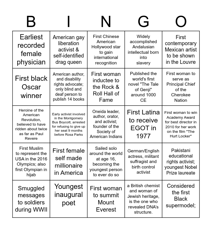 This bingo card has 25 words: First female self made millionaire in America, First woman to summit Mount Everest, First woman inductee to the Rock & Roll Hall of Fame, Smuggled messages to soldiers during WWII, First contemporary Mexican artist to be shown in the Louvre, Earliest recorded female physician, First black Oscar winner, American gay liberation activist & self-identified drag queen, First Latina to receive EGOT in 1977, Sailed solo around the world at age 16, becoming the youngest person to ever do so, Published the world's first novel "The Tale of Genji" around 1000 CE, Heroine of the American Revolution, believed to have ridden about twice as far as Paul Revere, German/English actress, militant suffragist and birth control activist, Pakistani educational rights activist; youngest Nobel Prize laureate, American author, and disability rights advocate; only blind and deaf person to publish 14 books, Considered the first Black supermodel;, First woman to win Academy Award for best director in 2010 for her work on the film "The Hurt Locker", First Chinese American Hollywood star to gain international recognition, First woman to serve as Principal Chief of the Cherokee Nation, Early activist involved in the Montgomery Bus Boycott, arrested for refusing to give up her seat 9 months before Rosa Parks, Oneida leader, author, orator, and activist; founder of the Society of American Indians, Youngest inaugural poet, First Muslim to represent the USA in the 2016 Olympics; also first Olympian in hijab, Widely accomplished Andalusian intellectual born into slavery and a British chemist and woman of Jewish heritage, is the one who revealed DNA’s structure..