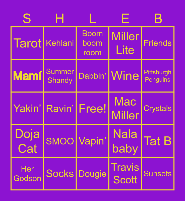 This bingo card has a free space and 24 words: SMOO, Socks, Dabbin’, Her Godson, Friends, Tarot, Mamí, Kehlani, Mac Miller, Vapin’, Wine, Yakin’, Nala baby, Tat B, Summer Shandy, Travis Scott, Crystals, Boom boom room, Pittsburgh Penguins, Ravin’, Sunsets, Doja Cat, Miller Lite and Dougie.