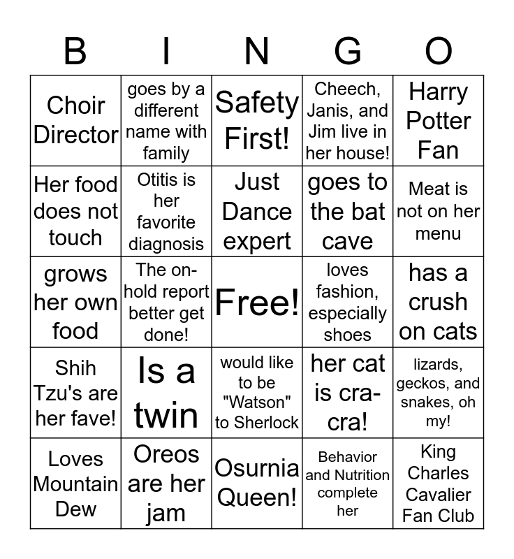 This bingo card has a free space and 24 words: Is a twin, Oreos are her jam, Just Dance expert, Loves Mountain Dew, Harry Potter Fan, Choir Director, Her food does not touch, goes by a different name with family, loves fashion, especially shoes, would like to be "Watson" to Sherlock, goes to the bat cave, grows her own food, her cat is cra-cra!, lizards, geckos, and snakes, oh my!, Otitis is her favorite diagnosis, Behavior and Nutrition complete her, has a crush on cats, Safety First!, Meat is not on her menu, The on-hold report better get done!, King Charles Cavalier Fan Club, Shih Tzu's are her fave!, Cheech, Janis, and Jim live in her house! and Osurnia Queen!.