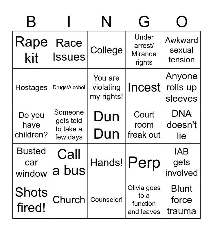 This bingo card has a free space and 34 words: He said/she said case, Olivia goes to a function and leaves, Shrink eval, In a park, Busted car window, Drugs/Alcohol, Awkward sexual tension, Shots fired!, Race Issues, Objection, You are violating my rights!, College, Witness killed/tampered with, Door kick in, Court room freak out, Anyone rolls up sleeves, Church, Do you have children?, Call a bus, Perp, Hands!, We're gonna get this guy, Rape kit, DNA doesn't lie, Counselor!, Blunt force trauma, Under arrest/ Miranda rights, Rikers, Incest, Hostages, Officer/Detective kills suspect, Someone gets told to take a few days, IAB gets involved and Wrong person arrested.
