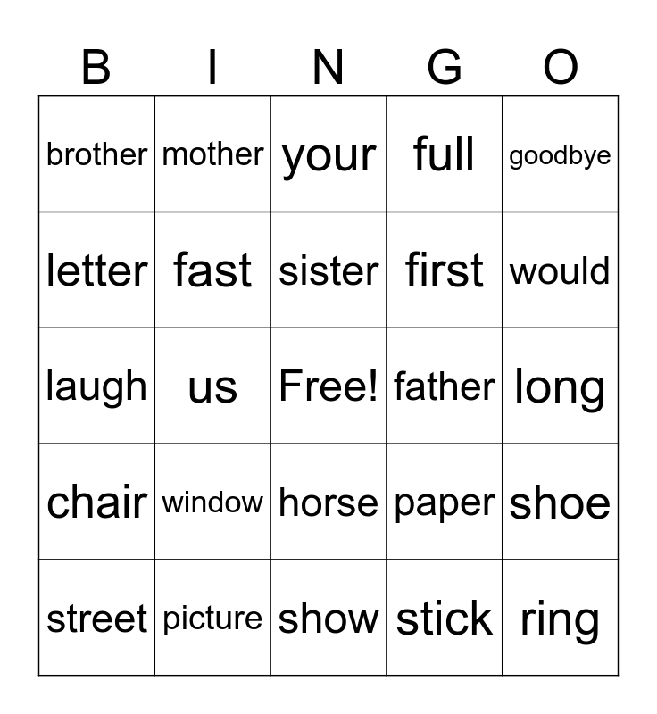 This bingo card has a free space and 24 words: window, picture, sister, street, goodbye, brother, letter, mother, father, horse, first, laugh, paper, shoe, fast, stick, long, your, would, us, ring, chair, full and show.