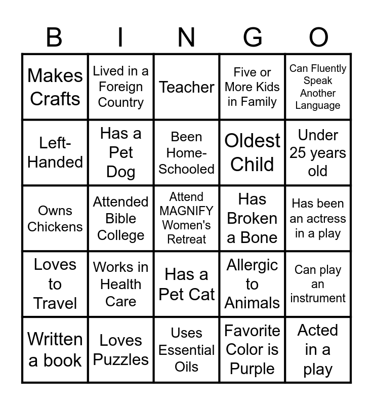 This bingo card has a free space and 24 words: Works in Health Care, Loves Puzzles, Been Home- Schooled, Written a book, Can Fluently Speak Another Language, Makes Crafts, Left-Handed, Lived in a Foreign Country, Has Broken a Bone, Has a Pet Cat, Oldest Child, Owns Chickens, Allergic to Animals, Can play an instrument, Has a Pet Dog, Favorite Color is Purple, Has been an actress in a play, Teacher, Under 25 years old, Attended Bible College, Acted in a play, Loves to Travel, Five or More Kids in Family and Uses Essential Oils.