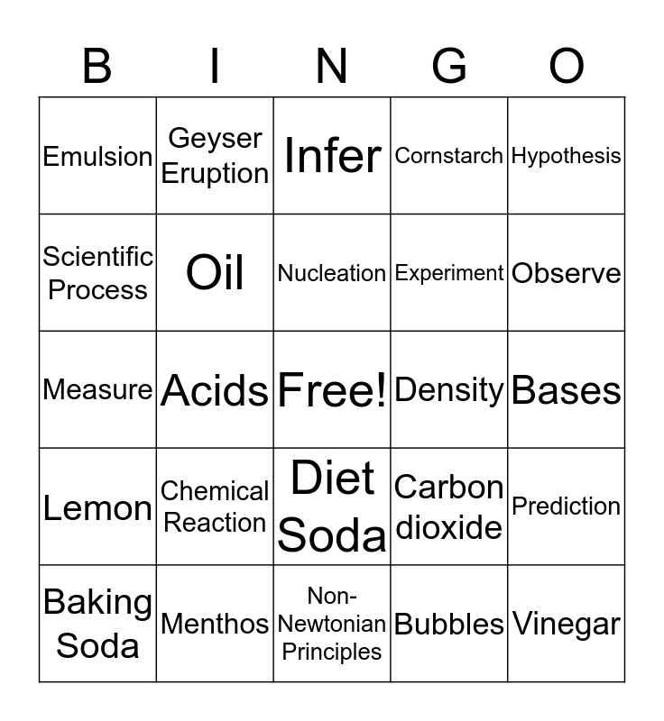 This bingo card has a free space and 24 words: Chemical Reaction, Menthos, Nucleation, Baking Soda, Hypothesis, Emulsion, Scientific Process, Geyser Eruption, Density, Diet Soda, Experiment, Measure, Carbon dioxide, Prediction, Oil, Bubbles, Bases, Infer, Observe, Acids, Vinegar, Lemon, Cornstarch and Non-Newtonian Principles.