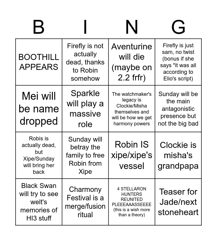 This bingo card has 16 words: Charmony Festival is a merge/fusion ritual, Clockie is misha's grandpapa, Aventurine will die (maybe on 2.2 frfr), BOOTHILL APPEARS, Robis is actually dead, but Xipe/Sunday will bring her back, Firefly is not actually dead, thanks to Robin somehow, Robin IS xipe/xipe's vessel, 4 STELLARON HUNTERS REUNITED PLEEEAAASSEEEE (this is a wish more than a theory), Mei will be name dropped, Sparkle will play a massive role, Black Swan will try to see welt's memories of HI3 stuff, Firefly is just sam, no twist (bonus if she says "it was all according to Elio's script), Sunday will betray the family to free Robin from Xipe, Sunday will be the main antagonistic presence but not the big bad, The watchmaker's legacy is Clockie/Misha themselves and will be how we get harmony powers and Teaser for Jade/next stoneheart.