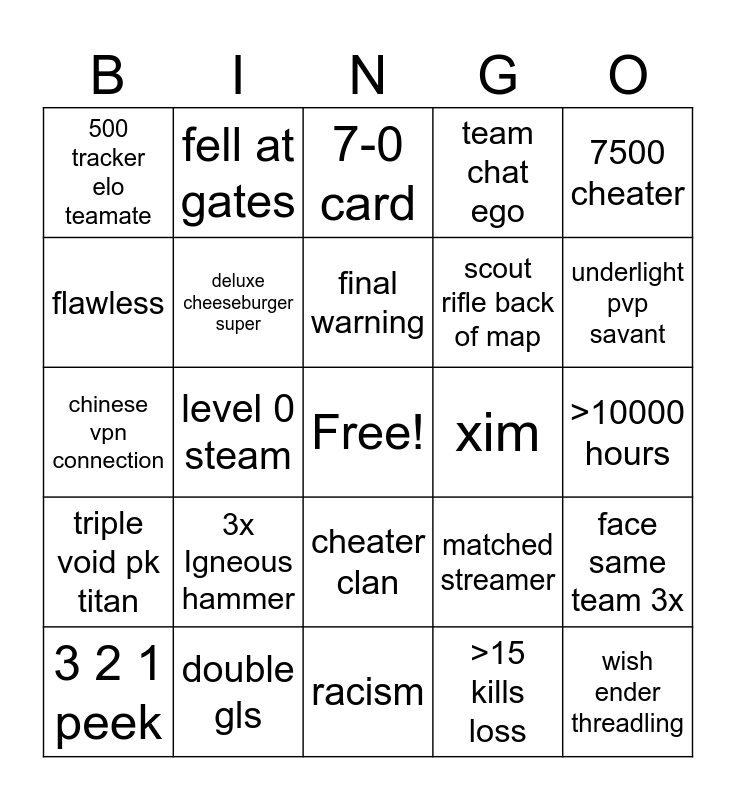 This bingo card has a free space and 24 words: 3x Igneous hammer, double gls, final warning, 3 2 1 peek, 7500 cheater, 500 tracker elo teamate, flawless, fell at gates, xim, cheater clan, scout rifle back of map, chinese vpn connection, matched streamer, face same team 3x, deluxe cheeseburger super, >15 kills loss, >10000 hours, 7-0 card, underlight pvp savant, level 0 steam, wish ender threadling, triple void pk titan, team chat ego and racism.