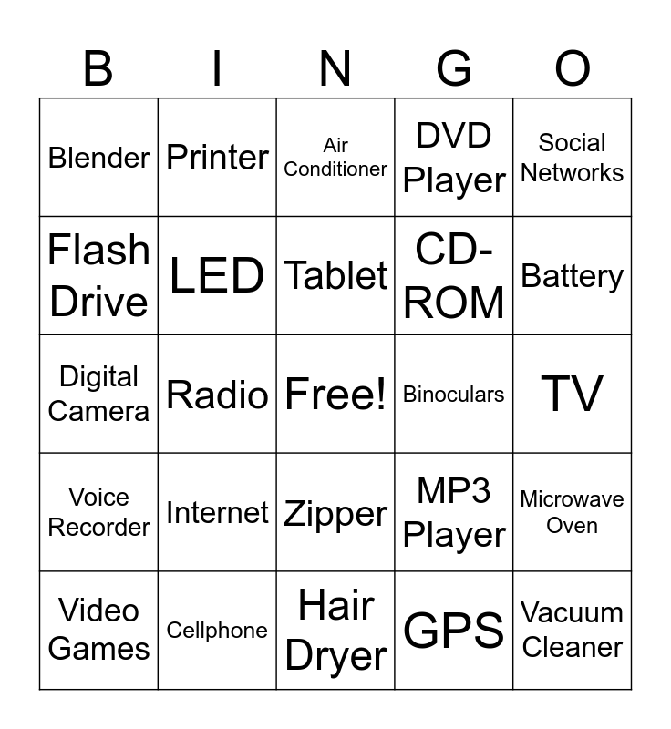 This bingo card has a free space and 24 words: Internet, Cellphone, Tablet, Video Games, Social Networks, Blender, Flash Drive, Printer, Binoculars, Zipper, CD-ROM, Digital Camera, MP3 Player, Microwave Oven, LED, GPS, TV, Air Conditioner, Battery, Radio, Vacuum Cleaner, Voice Recorder, DVD Player and Hair Dryer.