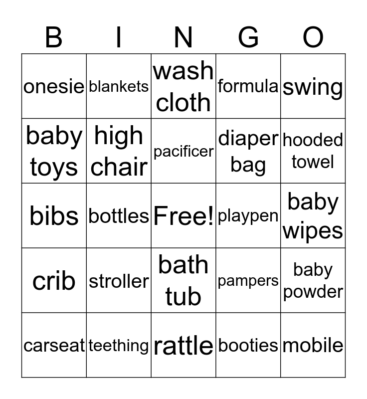 This bingo card has a free space and 24 words: stroller, teething, pacificer, carseat, swing, onesie, baby toys, blankets, playpen, bath tub, diaper bag, bibs, pampers, baby powder, high chair, booties, baby wipes, wash cloth, hooded towel, bottles, mobile, crib, formula and rattle.